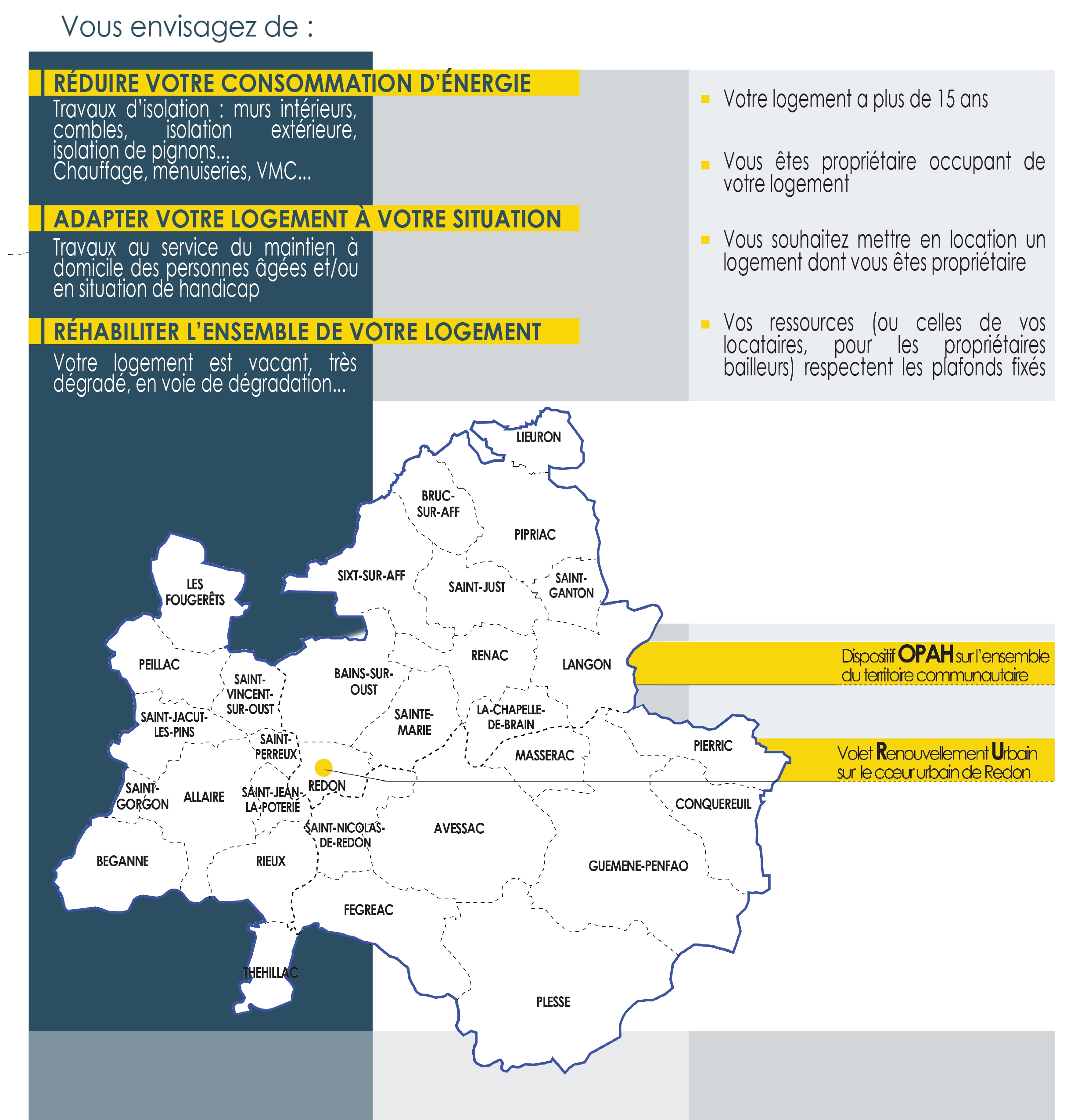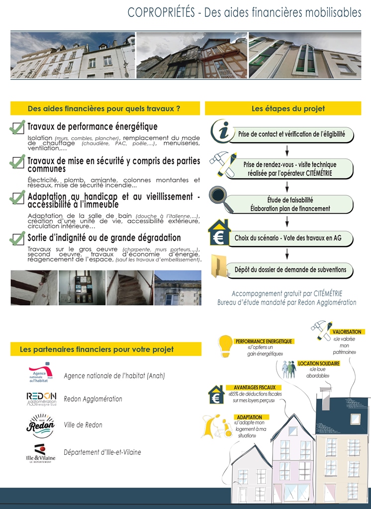 Sur ce périmètre spécifique, un co-financement établi entre REDON Agglomération et la Ville permet de proposer une aide financière plus importante pour les propriétaires (occupants et bailleurs) et les syndicats de copropriété souhaitant réaliser des travaux dans leur logement, ou au sein de leur immeuble de plus de 15 ans.