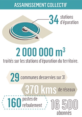 Via 370 kms d'égouts, les eaux usées du territoire sont acheminées vers 34 stations d'épuration de technologie différentes (boues activées, filtres plantés de roseaux, lagunes, etc.).