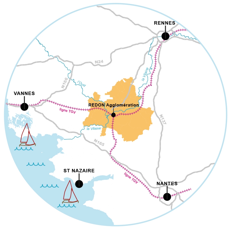 A 40 minutes de l'océan, au carrefour de 2 régions (Bretagne et Pays de Loire) et 3 Départements, (Ille-et-Vilaine, Morbihan, Loire-Atlantique), le territoire est idéalement positionné au coeur de l'espace stratégique Rennes / Nantes / Vannes / Saint-Nazaire.