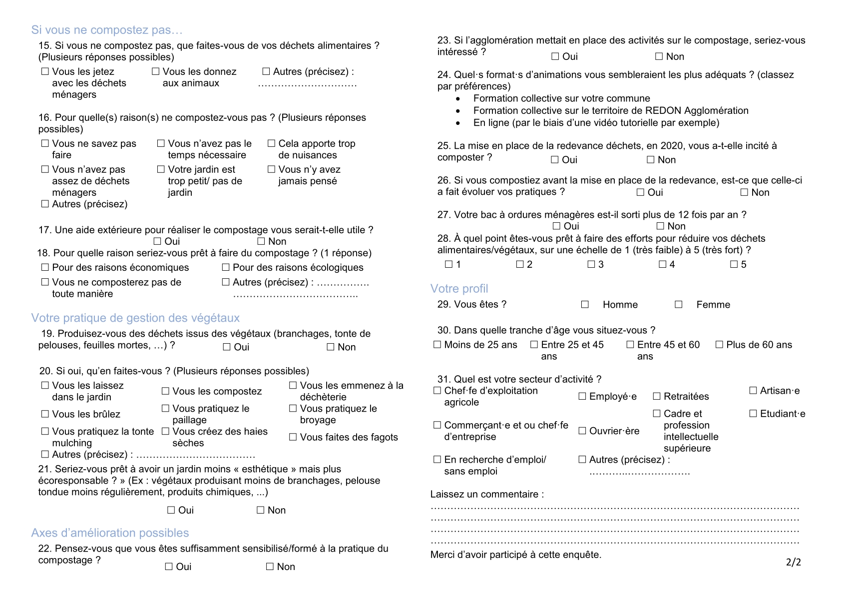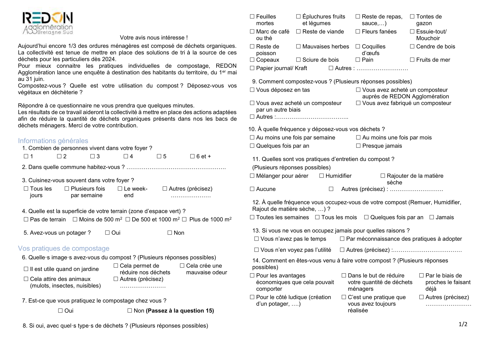 /// SONDAGE CLOS /// Aujourd’hui encore, 1/3 des ordures ménagères est composé de déchets organiques. Compostez-vous ? Quelle est votre utilisation du compost ? Déposez-vous vos végétaux en déchèterie ? Votre avis nous intéresse ! La collectivité sera tenue de mettre en place des solutions de tri à la source de ces déchets pour les particuliers, dès 2024. Pour mieux connaitre les pratiques individuelles, REDON Agglomération lance une enquête à destination des habitants du territoire, du 1er mai au 30 juin.