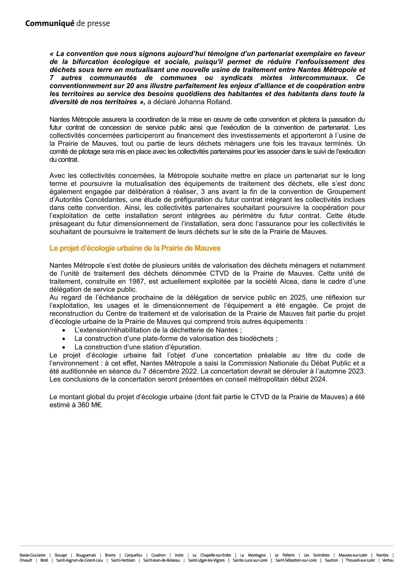 Johanna Rolland, maire de Nantes, présidente de Nantes Métropole et Mahel Coppey vice-présidente de Nantes Métropole en charge des déchets, de l’économie circulaire et de l’économie sociale et solidaire, ont signé la convention de Groupement d’Autorités Concédantes du futur centre de traitement et de valorisation des déchets de la Prairie de Mauves avec les 7 Établissements publics de coopération intercommunale concernés :