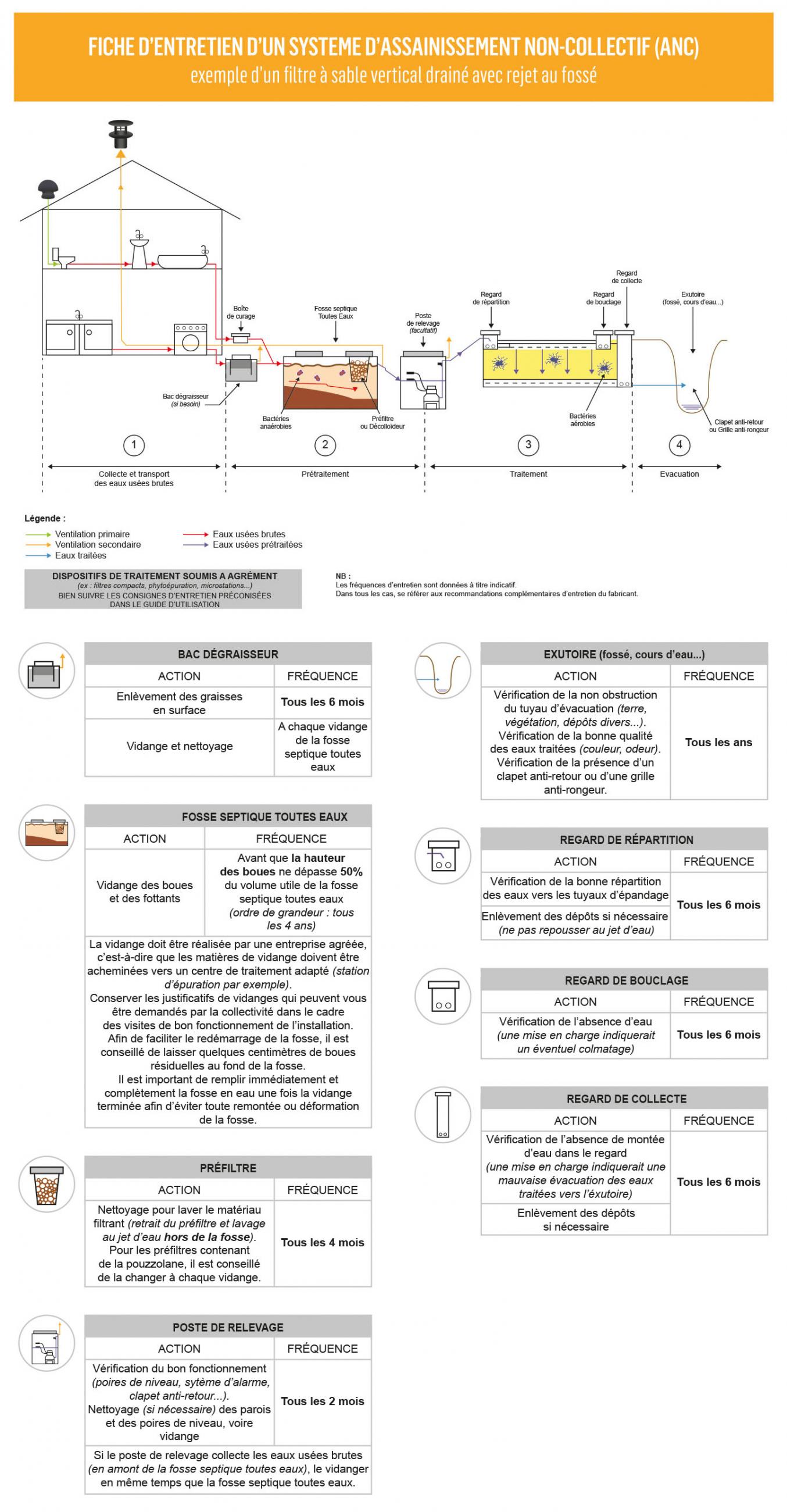 Tous les dispositifs de traitement des eaux usées sont concernés, y compris les plus rudimentaires. On notera par exemple qu’une fosse toutes eaux (FTE) doit être vidangée à intervalles réguliers, et impérativement lorsque la quantité de boues atteint 50% du volume de la FTE.