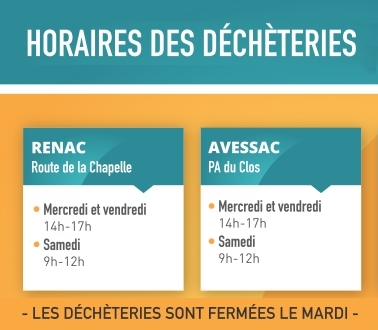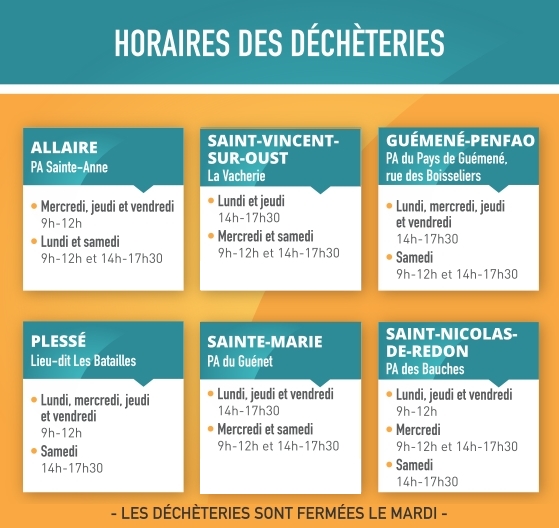 Les déchèteries d'Allaire, Guémené-Penfao, Saint-Nicolas-de-Redon, Saint-Vincent-sur-Oust, Sainte-Marie, Plessé sont accessibles aux jours et horaires habituels. Les sites de Renac et Avessac restent fermés jusqu'à nouvel ordre.