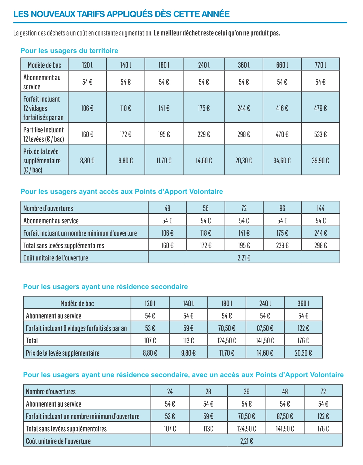 Pour les particuliers comme pour les professionnels, une hausse des tarifs est appliquée cette année*, afin de maintenir un budget équilibré en dépenses et en recettes.